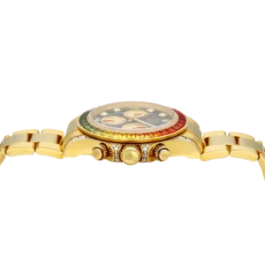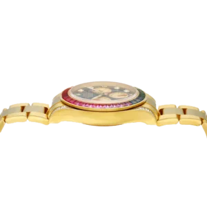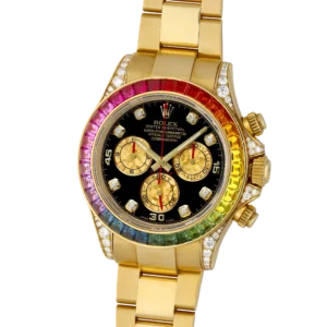 The Rolex Daytona 116598RBOW, known as the “Rainbow Daytona,” is an extraordinary expression of luxury and artistry, crafted in 18k yellow gold. Its 40mm case is adorned with a breathtaking sapphire-set bezel featuring a gradient of rainbow hues, meticulously arranged to create a vibrant and seamless spectrum. The lugs and crown guards are further embellished with factory-set diamonds, adding to its dazzling appeal.